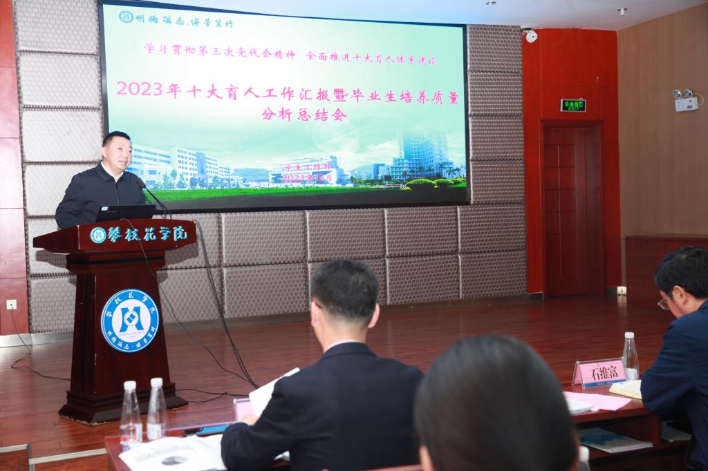 为学习贯彻学校第三次党代会精神,全面推进十大育人工作体系建设,有针对性提升人才培养质量,12月12日下午,学校在办公楼416会议室召开2023年十大育人工作汇报暨毕业生培养质量分析总结会。党委书记胥刚、副校长石维富,十大育人工作牵头单位负责人,相关职能部门负责人,各二级学院院长、分管学生工作领导参加会议。