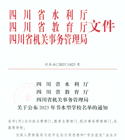 近日,四川省水利厅、四川省教育厅、四川省机关事务管理局联合印发了《关于公布2023年节水型学校名单的通知》。我校顺利通过了2023年度节水型高校复核和验收,达到《节水型高校评价标准》,被授予“四川省节水型高校”称号。