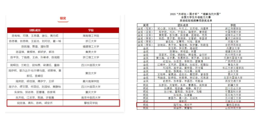 12月5日-8日,2025年“外研社·国才杯”“理解当代中国”全国大学生外语能力大赛全国总决赛在北京举行,我校外国语学院参赛团队(团队成员:祝定逸、高科、陈帆、胡安乔;指导教师:严艳、刘小宇、付乔)荣获全国总决赛英语组短视频赛项银奖。外国语学院与基础医学院组成的跨学院团队(团队成员:陶可怡、周欣平;指导教师:严艳、刘小宇、陈怡)荣获全国总决赛英语组短视频赛项铜奖。此次获奖实现我校学子在该项比赛全国总决赛中获奖零的突破。