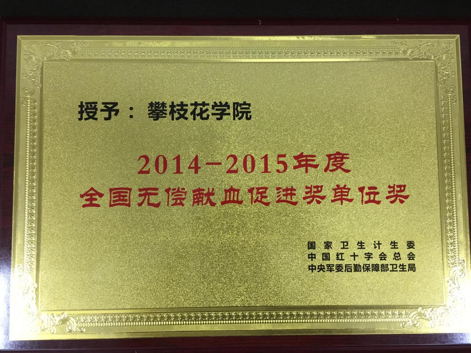 6月13日,在第14个“世界献血者日”攀枝花市献血表彰活动中,我校荣获“2014—2015年度全国无偿献血促进奖单位奖”。